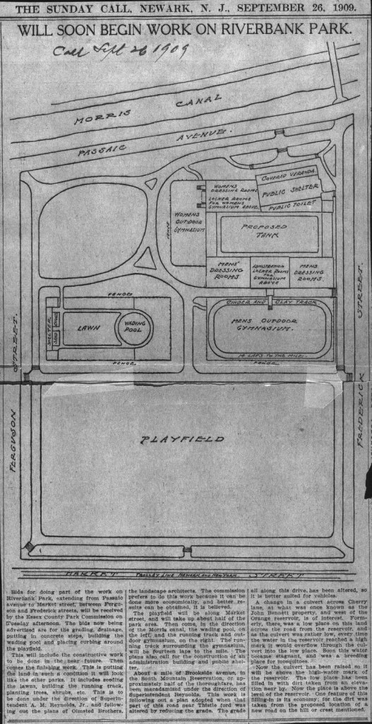 Franklin Murphy, former governor of NJ was a key figure in creating the park. He fought to pass legislation in 1894, which created park commissions and enabled the creation of the Essex County Park Commission. The master plan for the Essex County Parks, which included Riverbank, was created in 1894 with the assistance of Frederick Law Olmsted Sr.
