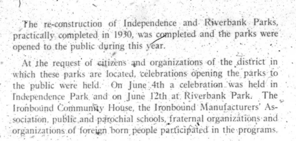 In 1927, Mayor Raymond proposed expanding the park, originally along the river. Eventually there was a plan that created the park as it is today. After the work was done there was a reopening celebration on Jun 12, 1931.