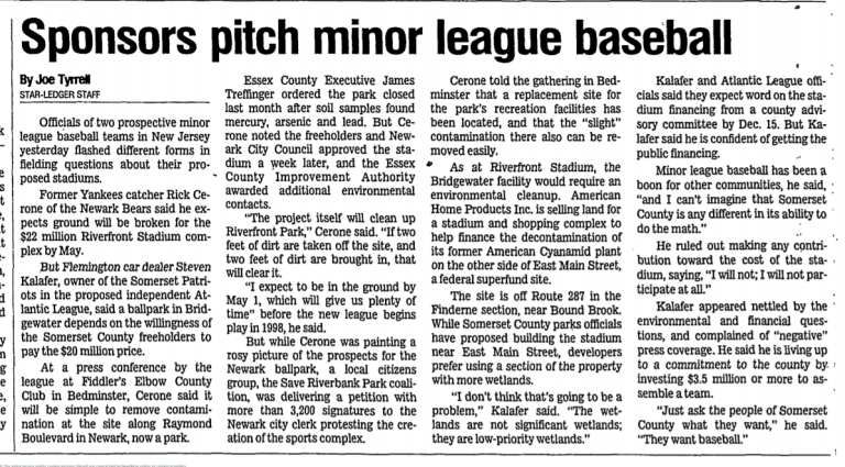 In 1996, the Ironbound community learned from a friend reading a suburban newspaper that Essex County and the City of Newark were making a deal with Rick Cerone, the ex-Yankee baseball player, to build a baseball stadium for the Newark Bears in Riverbank Park.