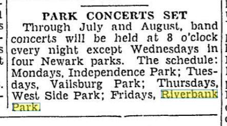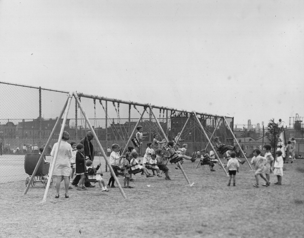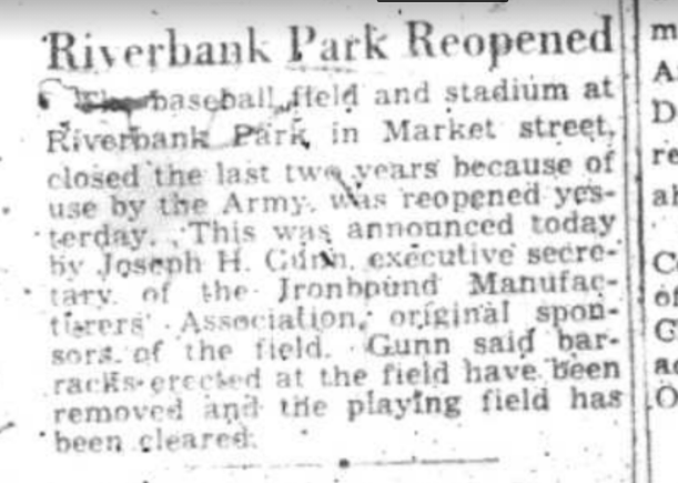 In 1907, plans began for a park on the site of Riverbank Park. In summer 1907 a temporary playground was constructed.